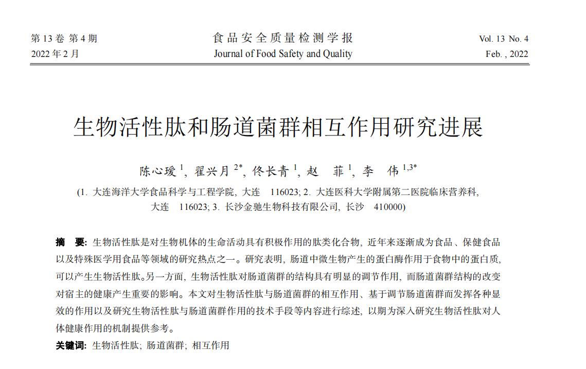 氨基酸與氨基酸之間通過(guò)酰胺鍵連接構(gòu)成肽。由 2 個(gè)以上氨基酸組成的蛋白質(zhì)片段可根據(jù)酰胺鍵的多少分為寡肽、多肽等。生物活性肽是對(duì)生物機(jī)體的生命活動(dòng)有積極作用的肽類(lèi)化合物, 通常含有 2~20 個(gè)氨基酸殘基, 分子量小于 6000 Da?,F(xiàn)在科學(xué)研究表明, 從動(dòng)物、植物及微生物中都可以制備出肽類(lèi)活性物質(zhì)。食源性生物活性肽來(lái)自食物蛋白質(zhì), 具有良好的安全性、吸收性和營(yíng)養(yǎng)價(jià)值。因此, 食源性生物活性肽在食品、保健食品及特殊醫(yī)學(xué)用食品領(lǐng)域具有著廣泛的應(yīng)用前景。