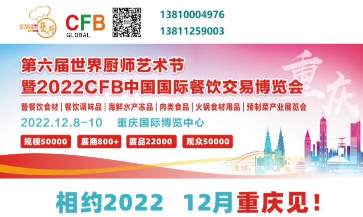 為更好的打造全球餐飲一站式采購(gòu)交易平臺(tái),“第六屆世界廚師藝術(shù)節(jié)暨2022CFB中國(guó)國(guó)際餐飲交易博覽會(huì)”將移師“國(guó)際消費(fèi)中心城市”“中國(guó)火鍋之都、美食之都和餐飲食材標(biāo)準(zhǔn)化生產(chǎn)強(qiáng)省與餐飲食材交易的天然集散地”重慶,于2022年12月8-10日在重慶國(guó)際博覽中心隆重舉辦,展出面積36000平米,匯集全球800家餐飲產(chǎn)業(yè)鏈品牌企業(yè)的22000多種餐飲產(chǎn)業(yè)鏈優(yōu)質(zhì)產(chǎn)品,60余項(xiàng)國(guó)際合作項(xiàng)目、20余場(chǎng)同期活動(dòng),5000余餐飲行業(yè)領(lǐng)袖及餐飲專業(yè)觀眾近50000萬(wàn)余人, 150余家主流媒體+餐飲行業(yè)媒體聚焦此次盛會(huì)。